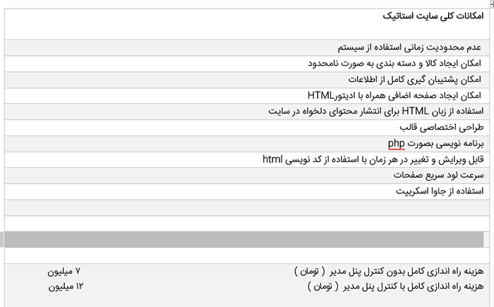 سایت ایستا یا استاتیک : به سایت هایی گفته می شود که با استفاده از html,css,js طراحی می شوند و فاقد سیستم مدیریت هستند و هر گونه تغییر و اصلاح روی این سایت ها باید توسط برنامه نویس انجام بگیرد.